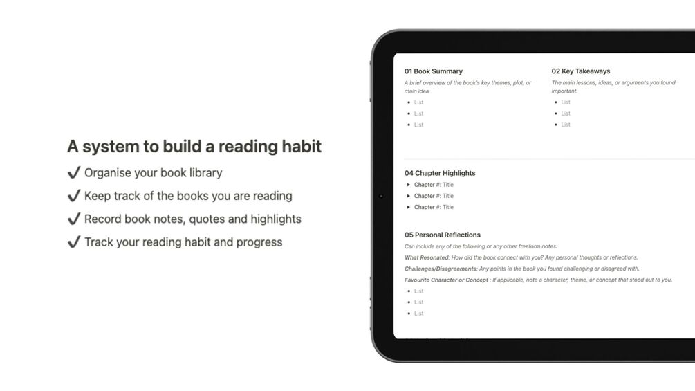 • Pre-Built Book Entry Pages: Individual book pages pre-configured with sections for summaries, highlights, and key takeaways.
